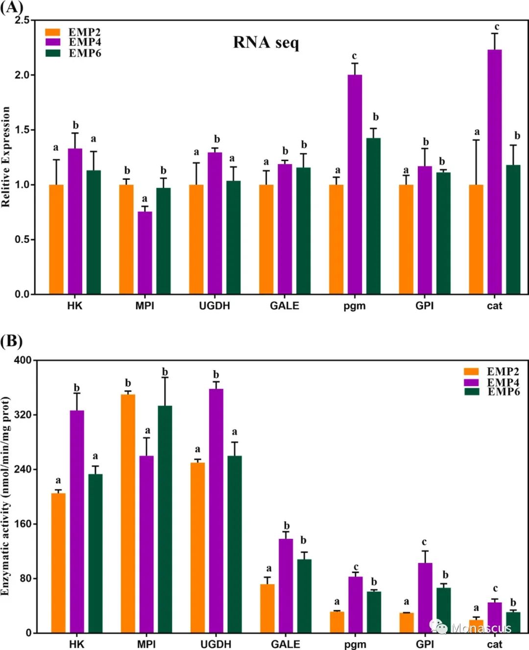 圖8:(A) RNA-seq結(jié)果中影響EPS合成的關(guān)鍵酶(HK、MPI、UGDH、GALE、pgm、GPI和cat)的表達(dá)。(B)影響紫色紅曲不同發(fā)酵時(shí)期EPS合成的關(guān)鍵酶(HK、MPI、UGDH、GALE、pgm、GPI和cat)的活性。